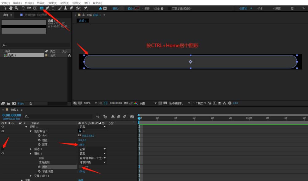 2、選擇圓角矩形工具,再新建的舞臺畫出一個圓角矩形,調整角的圓度,去掉描邊路徑的眼睛,填充好進度條底顏色,然后按CTRL+HOME居中圖形在舞臺中央。