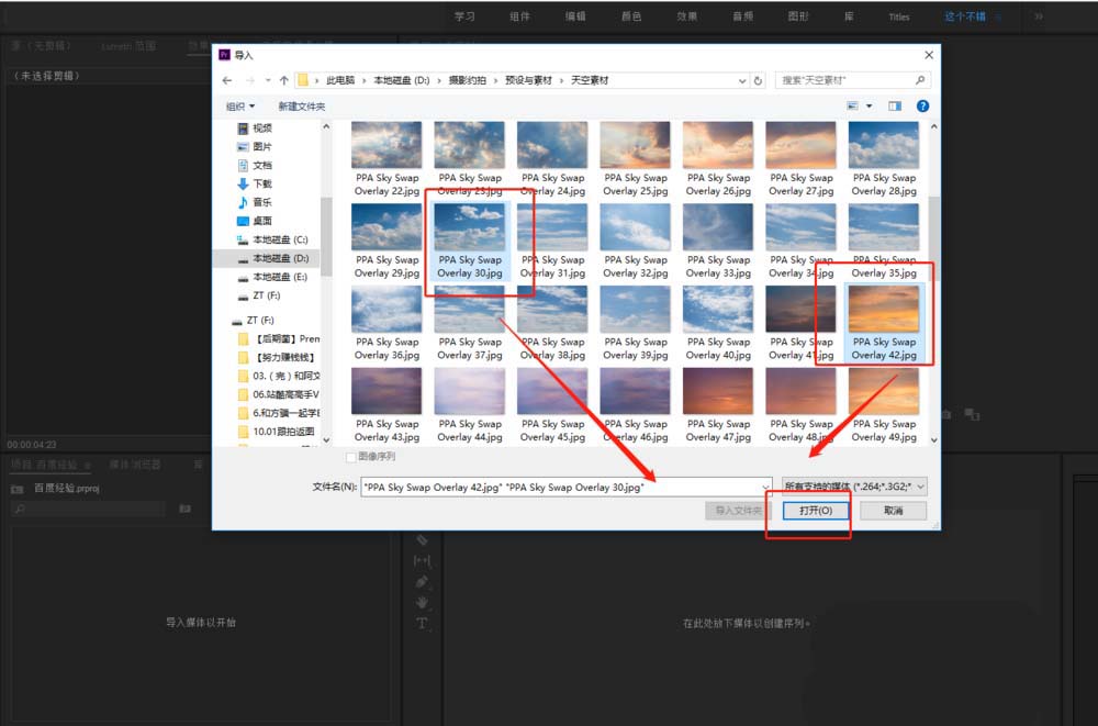 2、按Ctrl+I這個快捷鍵執行導入,在彈出的導入對話窗口中選擇兩個媒體素材導入到PR。