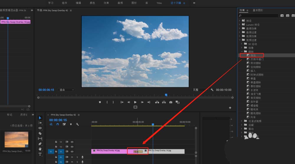 4、在PR視頻過渡中找到劃出這個過渡效果,按住鼠標左鍵不松將其拖到兩個媒體素材的中間。