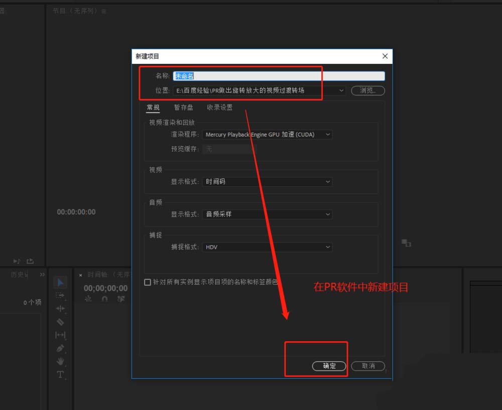 1、啟動打開Premiere軟件,選擇新建一個項目,設置這個項目的名稱與保存位置,點擊確定。
