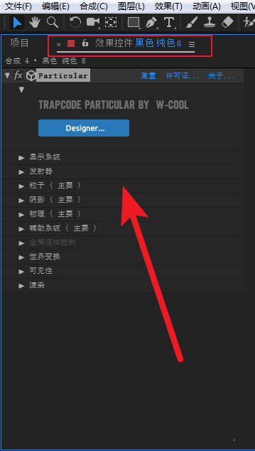 5、在效果控件面板里看到了加載的Particular效果的選項(xiàng)。