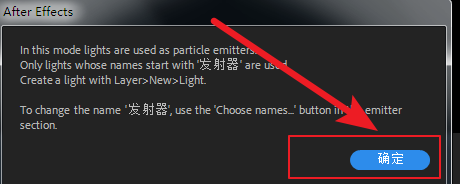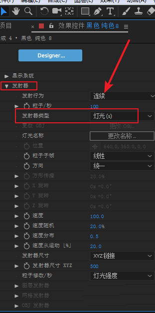 6、展開(kāi)發(fā)射器選項(xiàng)下面的發(fā)射器類(lèi)型下拉菜單,選擇為“燈光”。會(huì)彈出錯(cuò)誤提示,忽略它,點(diǎn)擊確定即可。