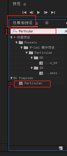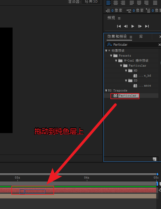 4、為純色層添加Particular效果,在右邊的找到效果和預(yù)設(shè)面板,在下面的搜索欄里輸入或粘貼“Particular”,這樣,搜索結(jié)果里就出現(xiàn)了RG Trapcode以及下面的Particular,將Particular效果拖動(dòng)到純色層上即可。