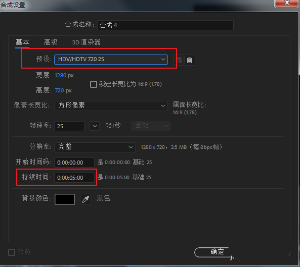 1、新建合成,選擇HDTV 720 25的預(yù)設(shè),即1280*720尺寸的合成。