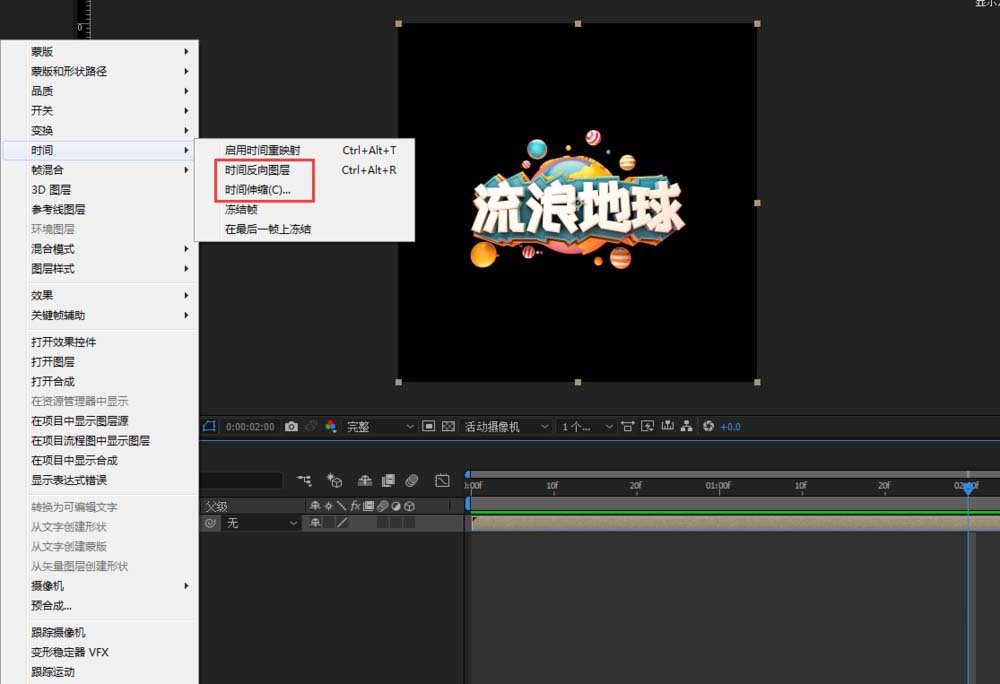 5、ctrl+shift+c選中所有圖層,新建預(yù)合成,然后右擊選擇時間-時間反向?qū)樱瑢⒆龊玫男Ч狗牛蝗缓笤龠x時間-時間伸縮來調(diào)整時間節(jié)奏快慢;
