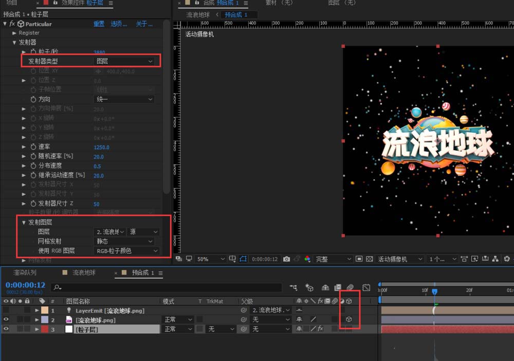 3、ctrl+y新建一個純色層命名為粒子層,并添加Particular粒子插件效果;調(diào)整相應(yīng)的參數(shù),將發(fā)射器的類型選擇為圖層,將發(fā)射圖層選擇為素材圖片(前提得打開素材圖片的3D開關(guān));