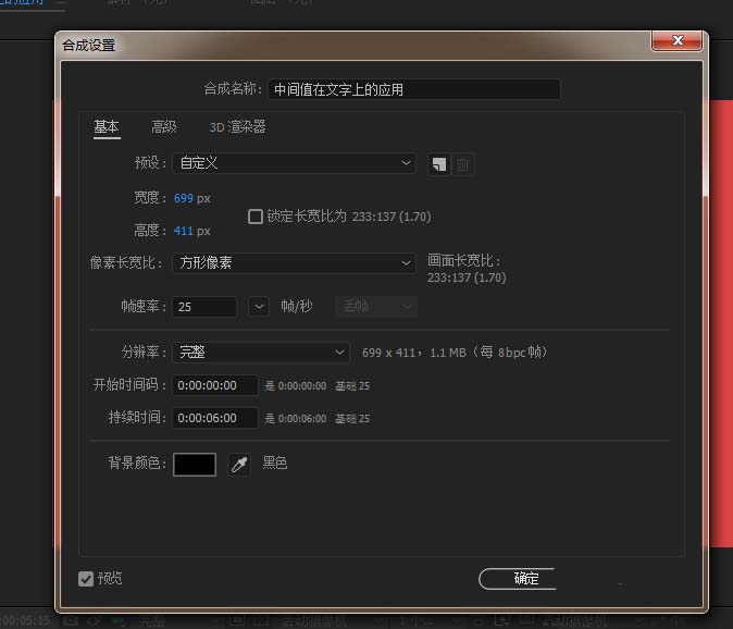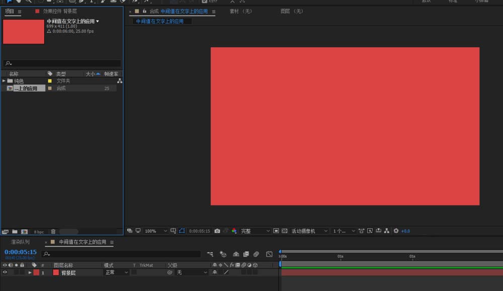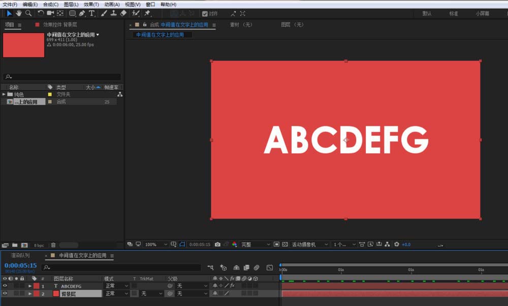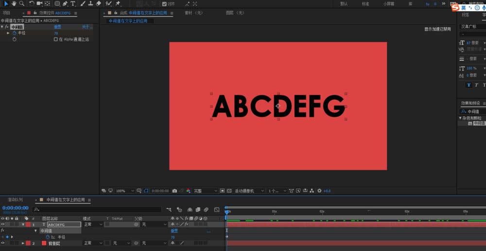 1、打開AE軟件,命名中間值在文字上的應用,調整相應的參數。