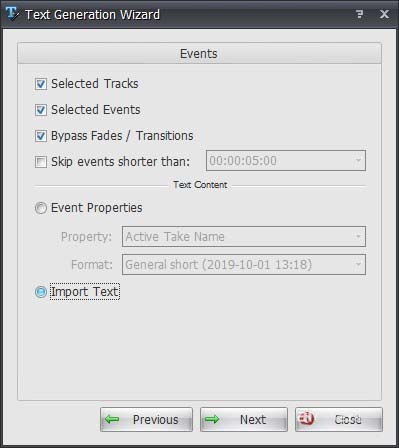 7、在對話框選第二個“Create text at events”,下面選擇之前保存的字幕預(yù)置,點Next。