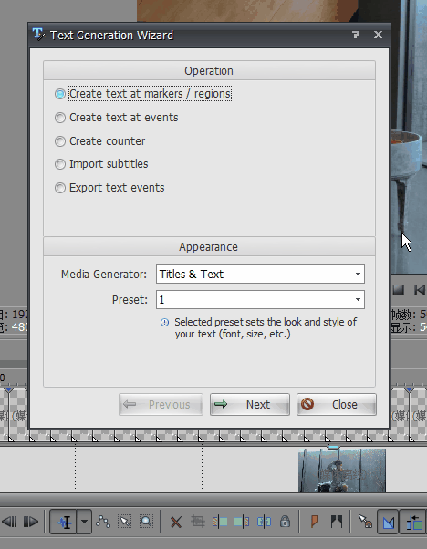6、用選擇工具選擇字幕,點擊Vegasaur——Timeline——Text Generation Wizard,彈出對話框。