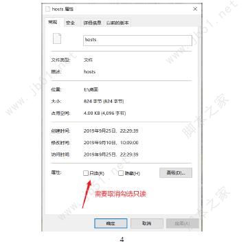 2、查看已經拷貝到桌面上的、查看已經拷貝到桌面上的hostshosts文件的屬性,如果有只讀屬性,需要取消文件的屬性,如果有只讀屬性,需要取消