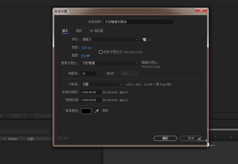 1、打開AE軟件,命名文字隨音樂跳動,調整相應的參數。