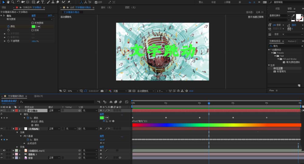 7、簡單又酷炫,讓文字隨著音樂的節拍跳動的效果就這樣實現了(任何想要的效果都可以用這個辦法去實現);我這邊再給文字添加一個填充效果,實現一個變色效果;
