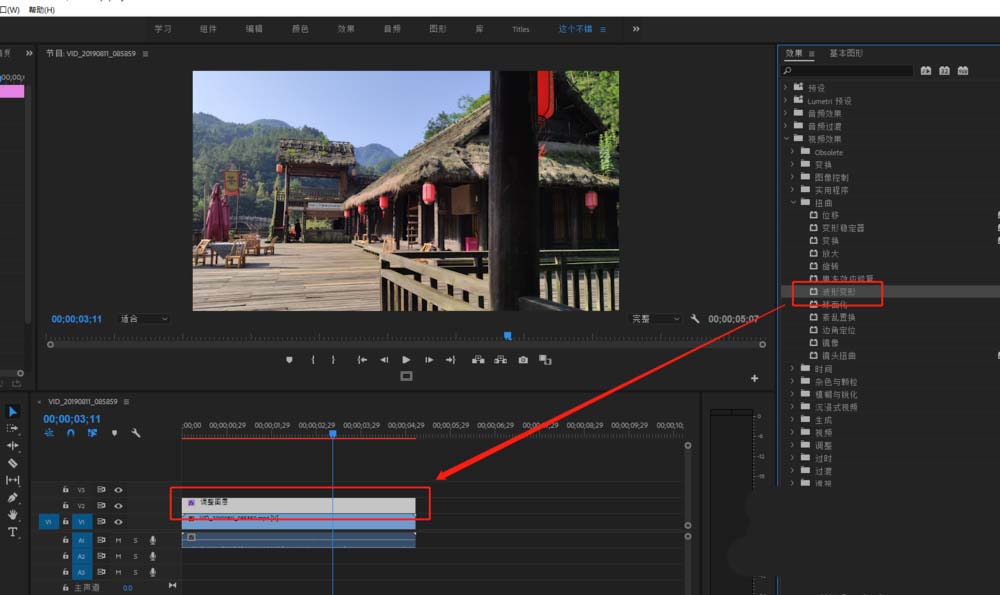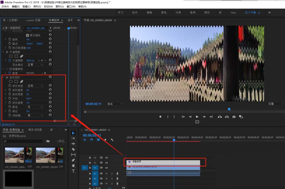 4、在效果窗口中搜索關鍵字或者直接找到視頻效果中的波形變形效果,將這個效果拖到調整圖層上。