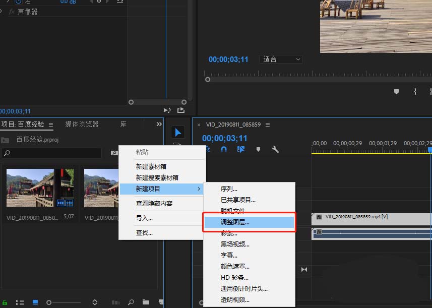 2、在PR剪輯項目窗口空白處單擊鼠標右鍵,在出現的鼠標右鍵選項中執行新建中的調整圖層選項。
