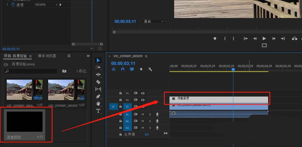 3、選擇項目窗口中新建的調整圖層,將這個新建的調整圖層選中并拖到序列的視頻軌道2,調整時間長度。