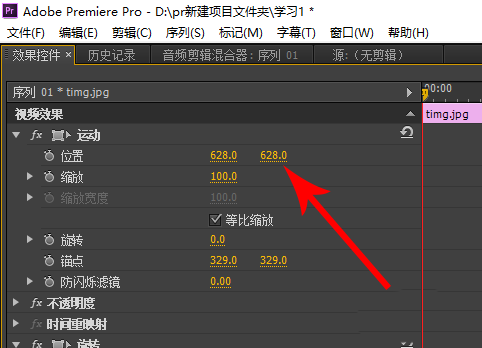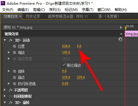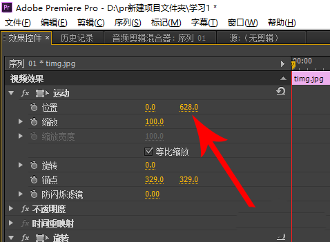 3、在效果控件面板修改位置坐標為(628,0),X軸坐標修改為628,這樣圖片中心點的位置便會移動至序列右上角位置,位置見下圖