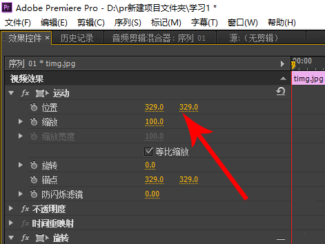 1、將圖片素材導入時間軸面板以后,圖片會覆蓋整個序列,并且圖片與序列中心重合,位置坐標為(329,329),由此可知,效果控件面板中的位置坐標是指的圖片中心點在序列上的位置坐標,位置見下圖
