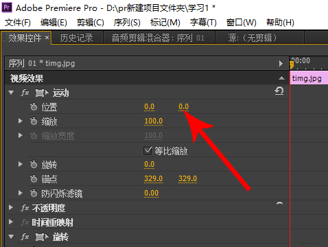 2、在效果控件面板修改位置坐標為(0,0),這樣圖片中心點的位置便會移動至序列左上角位置,位置見下圖