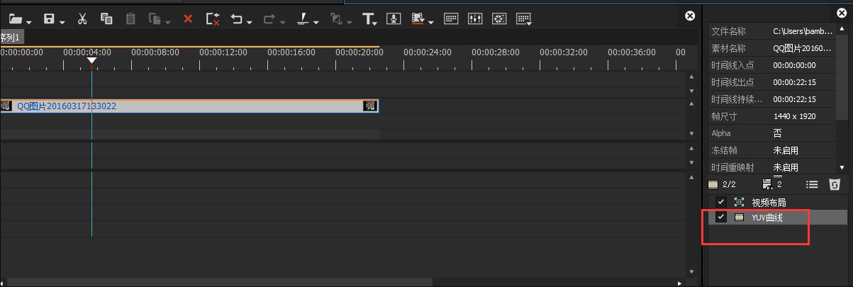 選擇YUV曲線,將其拖拽放置到時間軸上的素材中,在右邊信息窗口即可顯示YUV曲線,如圖,