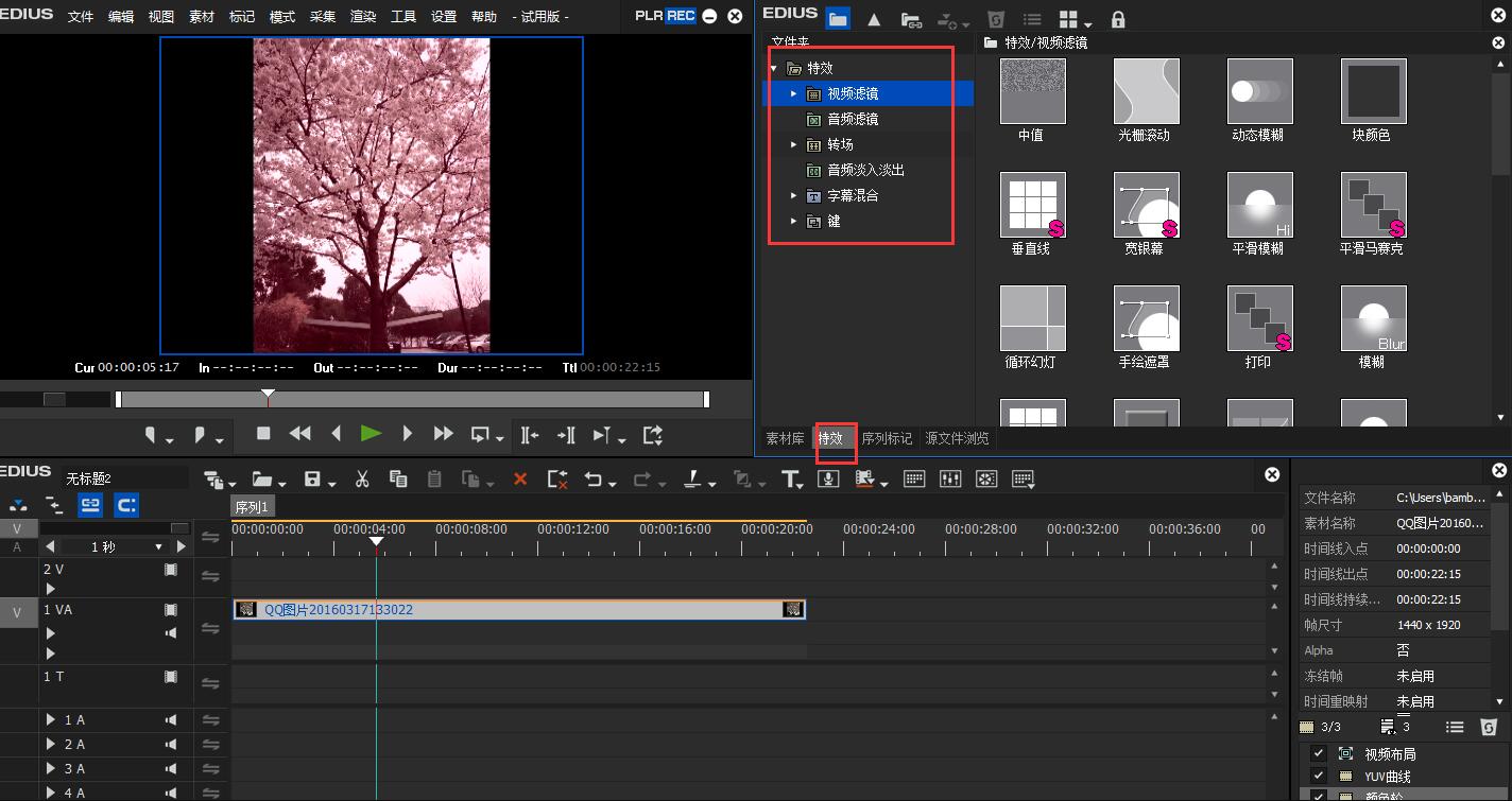 打開EDIUS軟件,進入界面,在素材庫窗口點擊展開【特效】一欄,如圖,