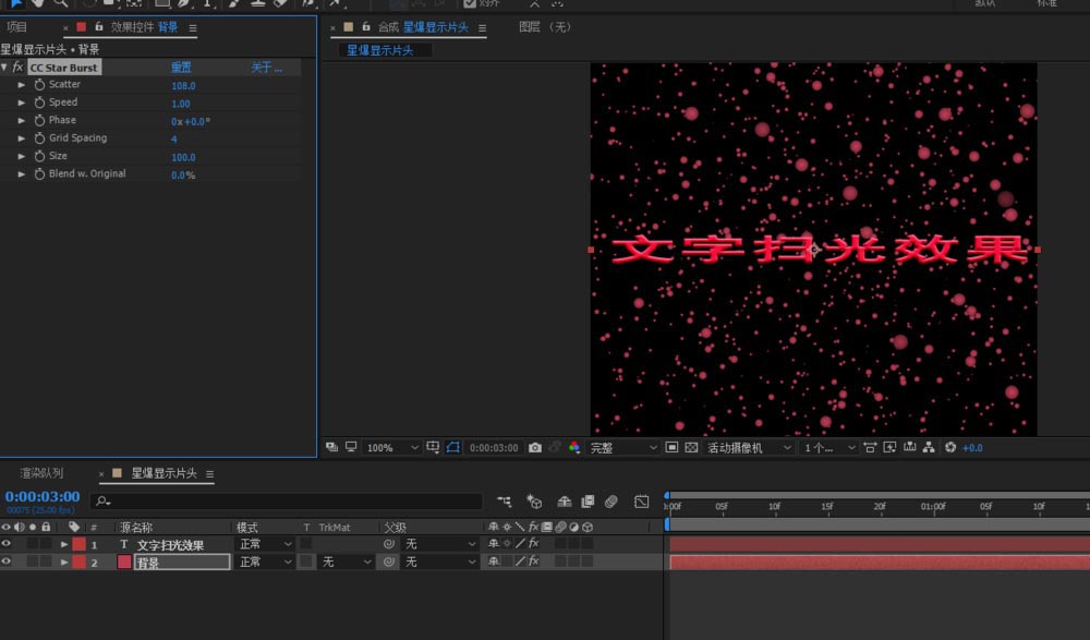 3、將背景顏色調整成想要的顏色,然后給背景圖層添加CC Star Burst 星爆效果;此時按下空格鍵就可以看到一個星爆的過程了;
