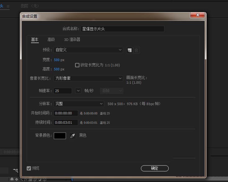 1、打開AE軟件,新建合成,命名星爆顯示片頭,調整相應的參數。