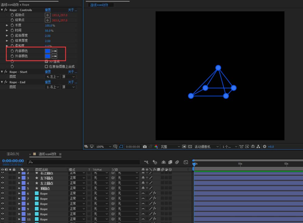 4、然后選中要連接的圓點,點擊Motion2插件的ROPE功能;可以修改連接線的顏色;