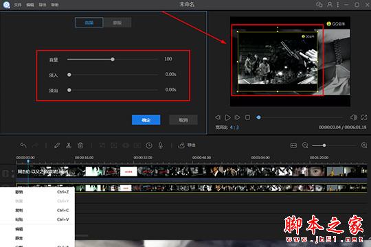 3,點擊播放按鈕進行播放,可以看到窗口中出現了兩個不同大小的畫面,其中較小的畫面就是畫中畫了,軟件默認將畫中畫的放置在中間的位置,如果你想要對其進行調整,則可以雙擊下方時間線中的畫中畫的視頻文件,也可以右鍵選擇并點擊其中的“編輯”選項,在播放窗口選擇黃色邊框調整位置,接著在左邊的音頻欄中調整畫中畫的音量、淡入與淡出等數值,如下圖所示: