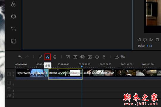 2、如果你同時導入了多段視頻,那么視頻的總時長將會達到一個驚人的數字,如果你想制作小視頻,則需要將視頻的內容進行裁剪,移動時間軸上的時間線,將其拖動到想要分割的時間點,點擊上方功能欄中的“分割”選項,大家可以進行多段時間點的分割,知道選取到自己滿意的內容為止,如下圖所示: