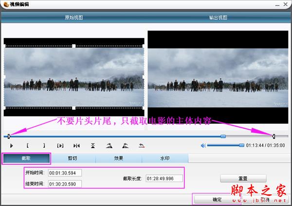 接著大家請點擊界面左上方的“視頻編輯”功能選項,請拖動播放狀態條以確認片頭及片尾占用的時間段,再依次點擊“截取——確定”功能按鈕。
