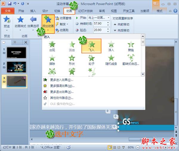 讓字幕變成滾動(dòng)狀態(tài),那就要給文字添加一個(gè)動(dòng)畫特效。如圖所示,先選中文字,然后點(diǎn)擊“動(dòng)畫”,下拉菜單中選擇“添加動(dòng)畫”,子下拉菜單中選擇一個(gè)“飛入”特效。如圖所示。