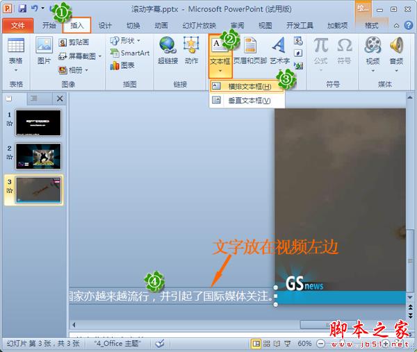 插入文字做為字幕。步驟是點(diǎn)擊“插入”,下拉菜單中選擇“文本框”-“橫排文本框”,然后鼠標(biāo)在幻燈片上的視頻的左下邊點(diǎn)擊一下,就會(huì)輸出框,將文字輸入進(jìn)去就好了。文字大小、顏色都可以調(diào)整的。