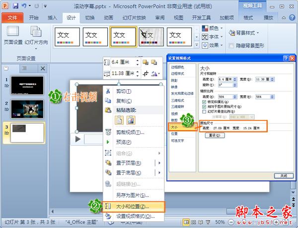 查看視頻尺寸,只便設(shè)置幻燈片大小。步驟是右擊視頻,出現(xiàn)下拉菜單中選擇“大小和位置”,接著會(huì)彈出設(shè)置視頻格式的對(duì)話框,查看“大小”一項(xiàng)的“原始尺寸”,看到27.09x15.24厘米。記住數(shù)據(jù),關(guān)閉對(duì)話框。
