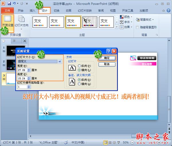 將幻燈片的大小設(shè)置一下,幻燈片大小與將要插入的視頻尺寸(分辨率)成正比,或兩者相同最佳!步驟:點(diǎn)擊“設(shè)計(jì)”-“頁面設(shè)置”,打開頁面設(shè)置對(duì)話框,填寫設(shè)置幻燈片的寬度和高度,幻燈片方向?yàn)闄M向,然后點(diǎn)擊“確定”返回。