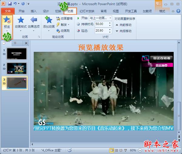 添加好特效后,可以預(yù)覽一下整體的效果。點(diǎn)擊“動(dòng)畫”,下拉菜單中的“預(yù)覽”,即會(huì)播放了。播放期間,鼠標(biāo)任意點(diǎn)擊一下,就會(huì)停止播放。也還可以再適當(dāng)?shù)奶砑悠渌?ldquo;裝飾”。