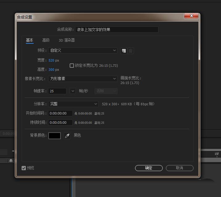 1、打開AE軟件,新建合成,命名液體上加文字的效果,調整相應的參數。