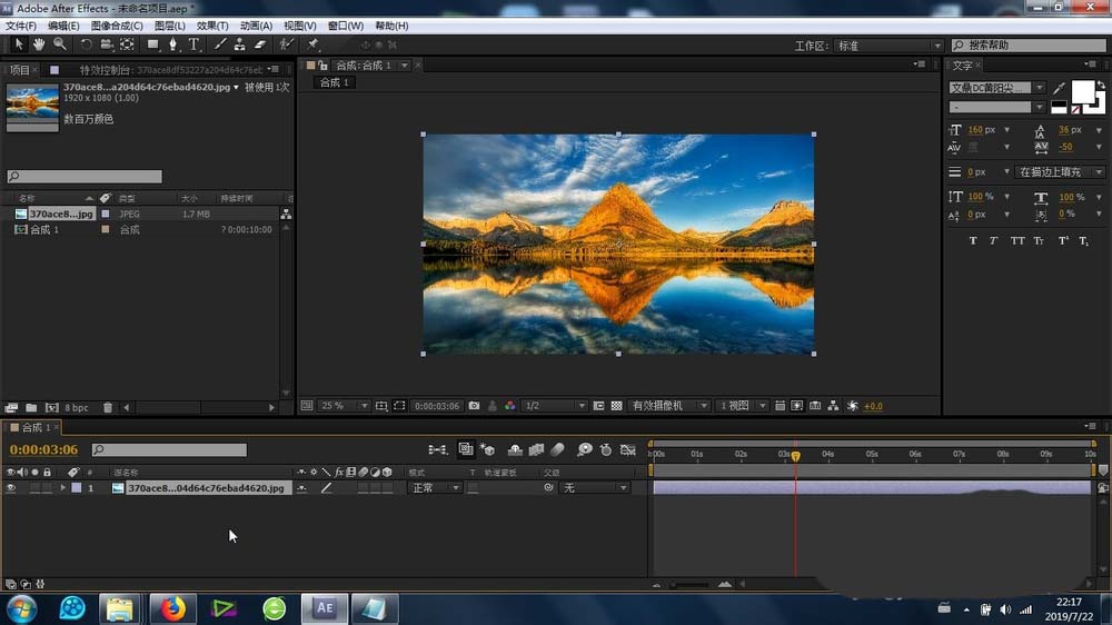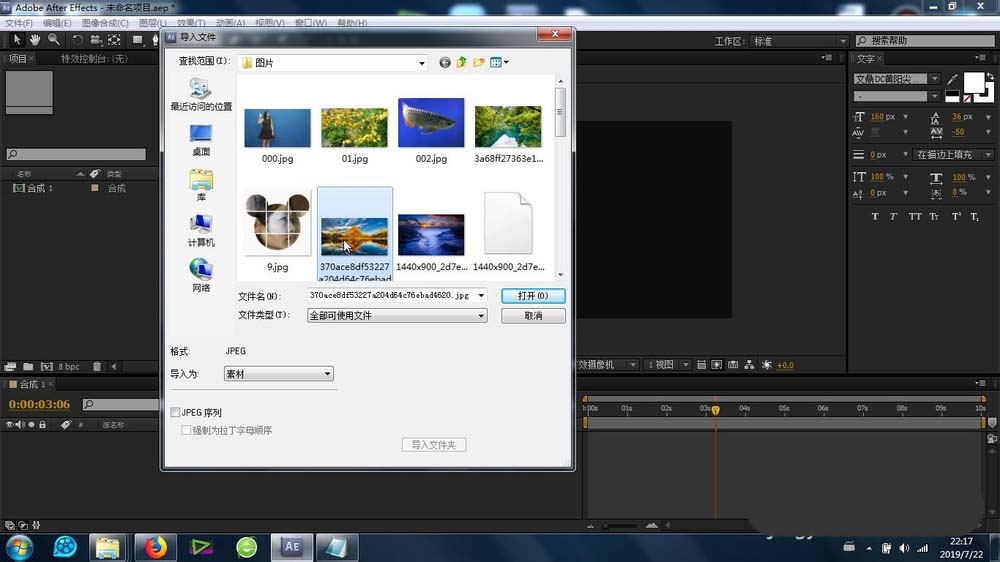 1、最首要的步驟就是圖片素材的素材庫導入,導進去之后再導入合成里面的時間線上
