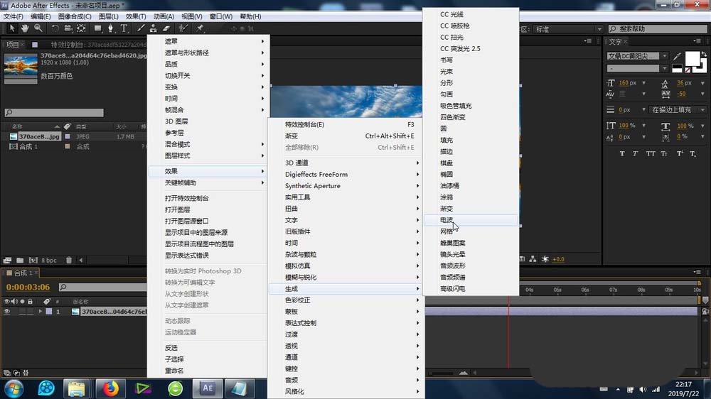 3、接下來的重點來了,選中素材,依次選擇:效果-生成-電波