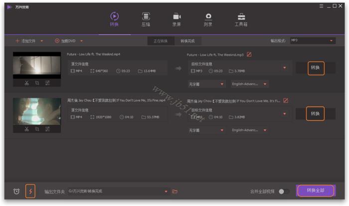 現(xiàn)在點(diǎn)擊轉(zhuǎn)換或全部轉(zhuǎn)換按鈕即可開始將視頻轉(zhuǎn)換成MP3音頻文件。