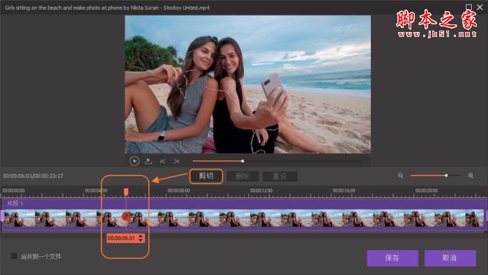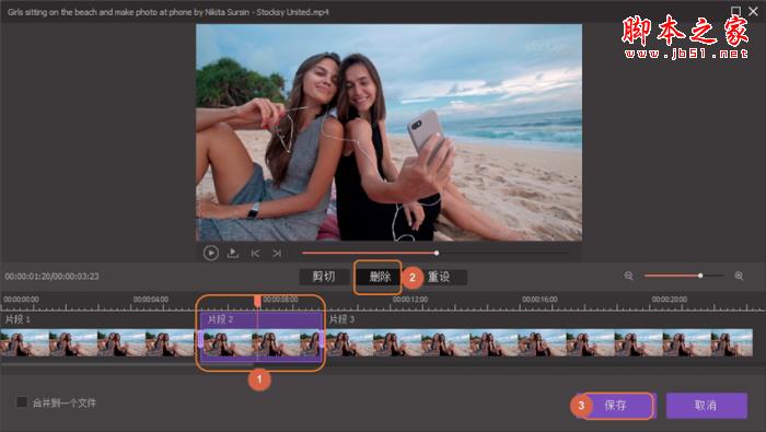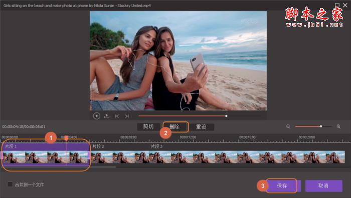 情況二:修剪視頻的中間部分 如果您需要修剪視頻的中間部分,只需要將滑塊拖至您要修剪的開端,然后點擊剪切按鈕,再把滑塊拖至您要修剪的尾端,同樣的點擊剪切按鈕,然后在中間的部分點擊刪除按鈕。最后點擊保存按鈕即可。