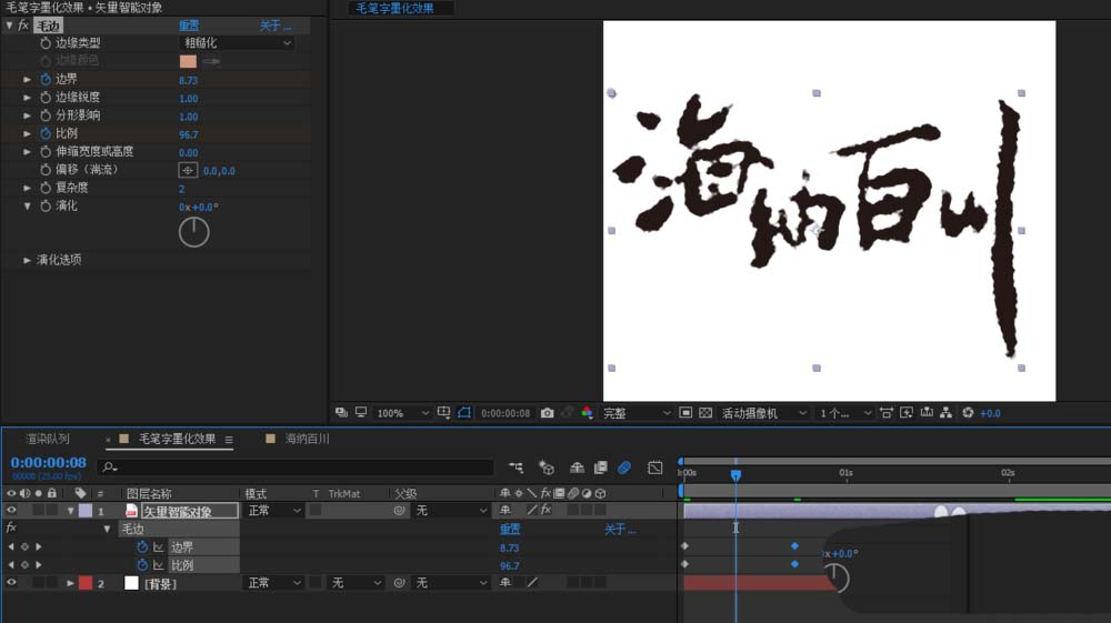 4、我們通過(guò)給毛邊效果的邊界和比例兩個(gè)屬性k關(guān)鍵幀,實(shí)現(xiàn)一個(gè)文字慢慢消散的效果;