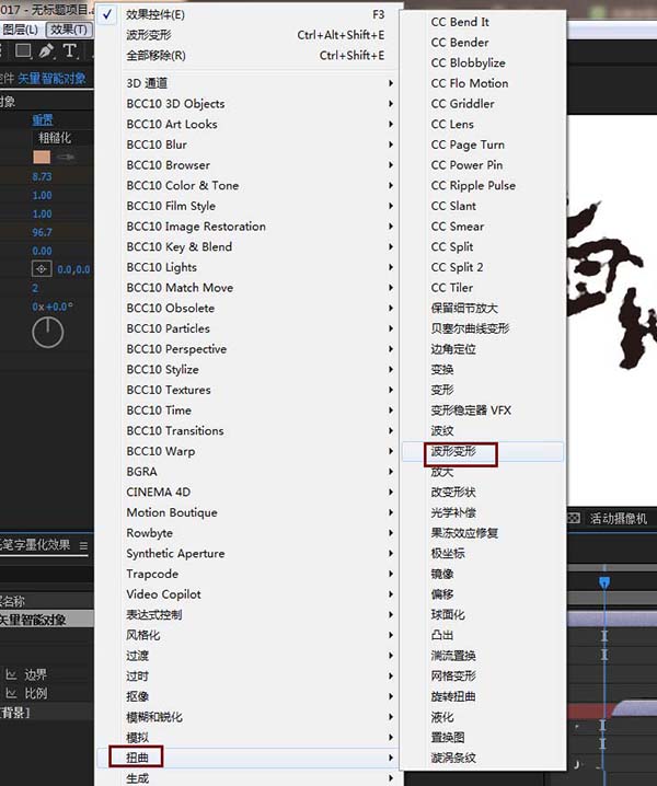 6、我們通過(guò)給波形變形效果的波形高度K關(guān)鍵幀,實(shí)現(xiàn)一個(gè)水波紋式的消失;