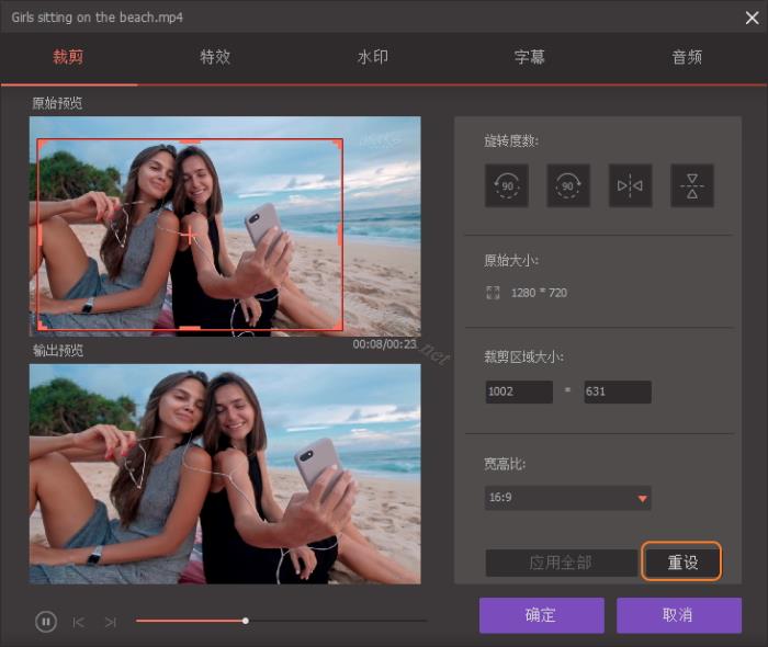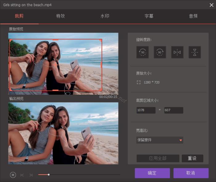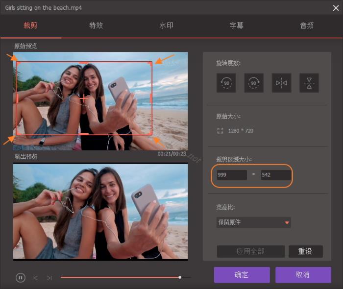 拖拉視頻的角落框或者輸入具體的寬度和高度即可設(shè)置裁剪面積大小。您可以馬上預覽效果。