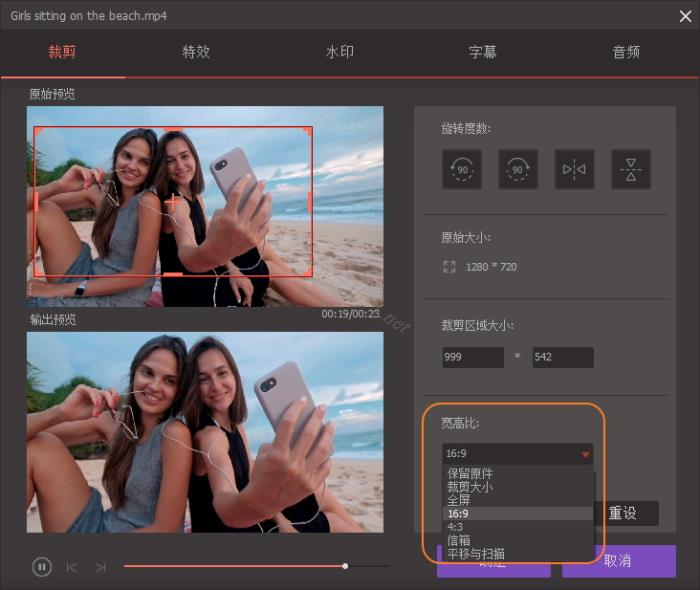 點擊寬高比的下拉式圖標。您可以選擇保留原件、裁剪大小、全屏、16:9等等。