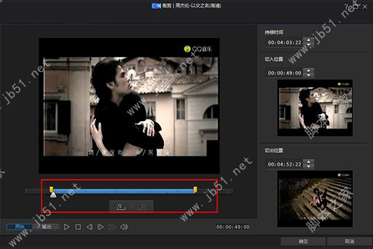 3、彈出裁剪的界面,其中的藍色框就是用戶想要保留的視頻內容,其余灰色的片段,就是將要刪除的片段,當然你也可以邊播放邊尋找裁剪的時間點,點擊“標記切入”或“標記切出”選項,全部完成后點擊“確定”選項,如下圖所示:
