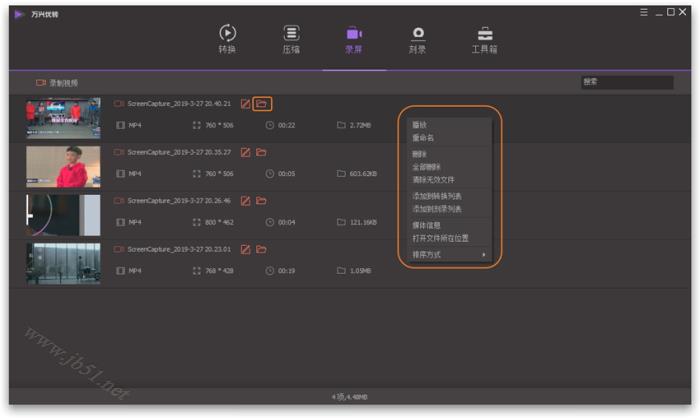 右鍵在您錄制的視頻,您可以更改視頻名字、播放或傳輸。