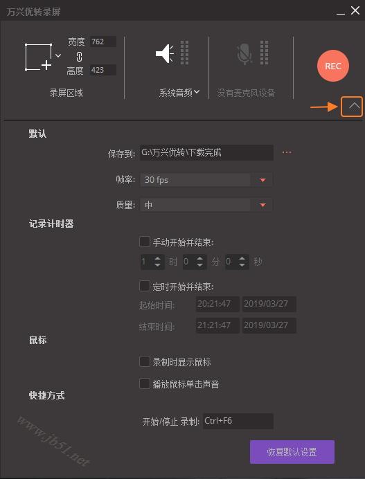 注意:點擊下拉式按鈕即可打開全部錄制設置。您可以調設記錄計時器快捷方式以及其他默認信例如:文件所在地、幀率和質量。