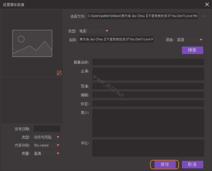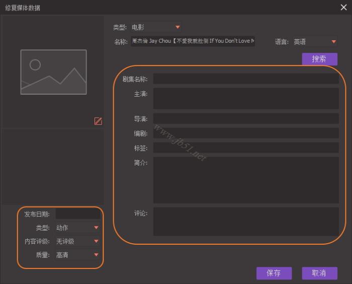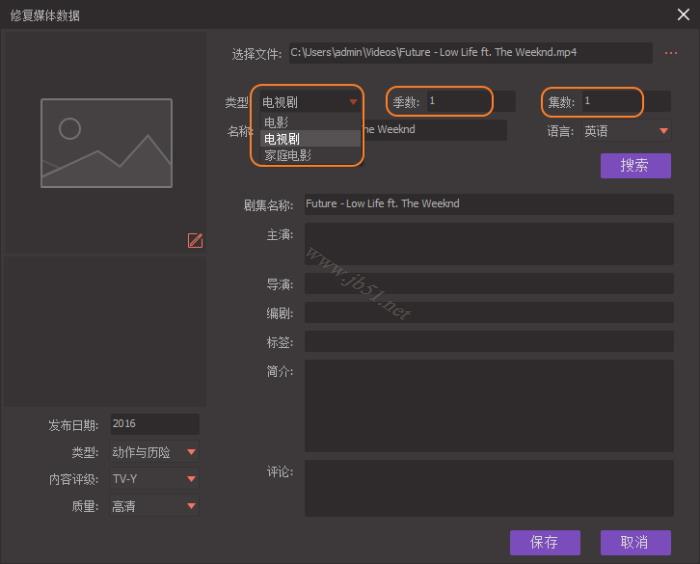第一個部分包含了類型、名字和語言,您可以手動編輯或點擊搜索讓系統自動修復。請注意,在類型里有三個選擇分別是:電影、電視劇、家庭電影,如果您選擇了電視劇,您將會看到季數和集數的選項出現。