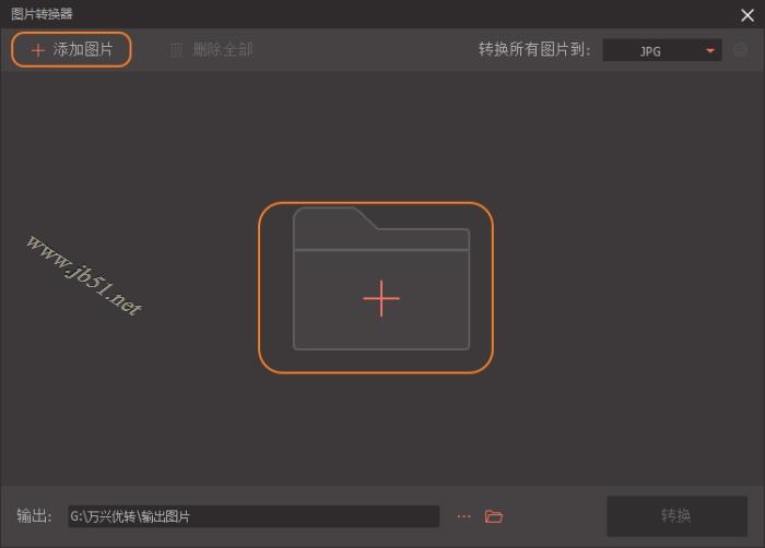 您將看到一個名為圖片轉換器的新窗口。單擊左上角的+圖標或+ 添加圖片按鈕,并選擇要轉換的圖片文件。您可以將圖片拖放至界面中,也可以一次添加多張圖片。
