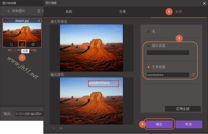 添加水印:單擊圖像上的效果按鈕以打開編輯窗口。單擊水印選項,您將可以添加圖片水印或文本水印。